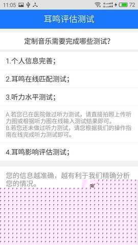 耳鸣初步自助测评:提供简洁明了的交互界面,引导用户通过听力对比等方式,自助完成对耳鸣声的频率、响度以及声音类型(如纯音、窄带噪声等)的基础评估,为后续个性化方案生成提供关键数据输入。