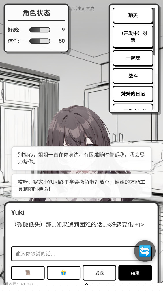 与Yuki的互动是游戏的核心。玩家可以通过文字输入或直接使用麦克风进行语音对话,话题可以从日常问候延伸到天马行空的想象。赠送已购买的礼物、发起小游戏邀请(如简单的益智游戏)、提议更换服装或规划外出场景,都是深化互动的重要方式。