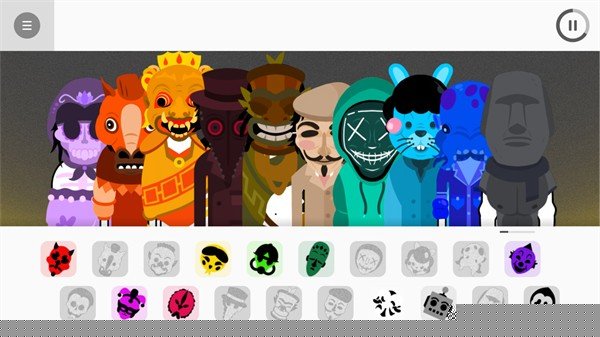 核心创作玩法:在游戏的主界面(工作室)中,屏幕下方会陈列当前已解锁的所有面具,按照其声音类型(如打击乐、低音、主旋律、装饰音)分类。玩家只需从中点选一个面具,将其拖拽到屏幕上方的角色站位区即可激活该音效。同一个站位区可以叠加多个同类面具以改变音色层次,不同站位区的面具则会播放,形成多声部合奏。实时混音台允许玩家单独调整每条音轨的音量或设置静音。