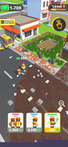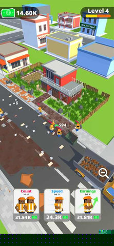 核心玩法循环:游戏以日为单位推进。每日开始前,你可以在车库检查装备状态、补充消耗品,并在地图上规划当日的重点清洁区域。进入工作后,左上角的UI会清晰显示当前区域的清洁度百分比、体力值、以及今日收入目标。你需要操作角色移动至垃圾附近,根据垃圾类型(干垃圾、湿垃圾、可回收物、有害垃圾)切换对应的工具进行清理。清理过程中要注意工具耐久度,及时回工作站维修。