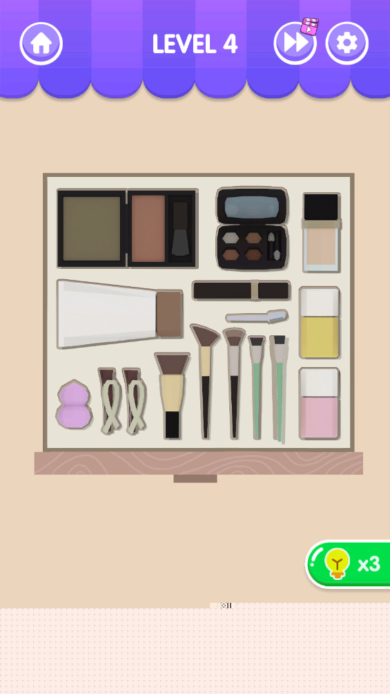 多样化的场景与物品库提供了持续的新鲜感。游戏并非局限于单一类型的整理,而是涵盖了美妆、文具、工具、厨具、衣物等多个主题。每个主题下的物品模型都独具特色,整理规则也略有不同,厨房关卡可能需要将刀具归入刀架,而书房关卡则需将书籍按大小排列。这种内容上的广度确保了游戏体验的多样性。
