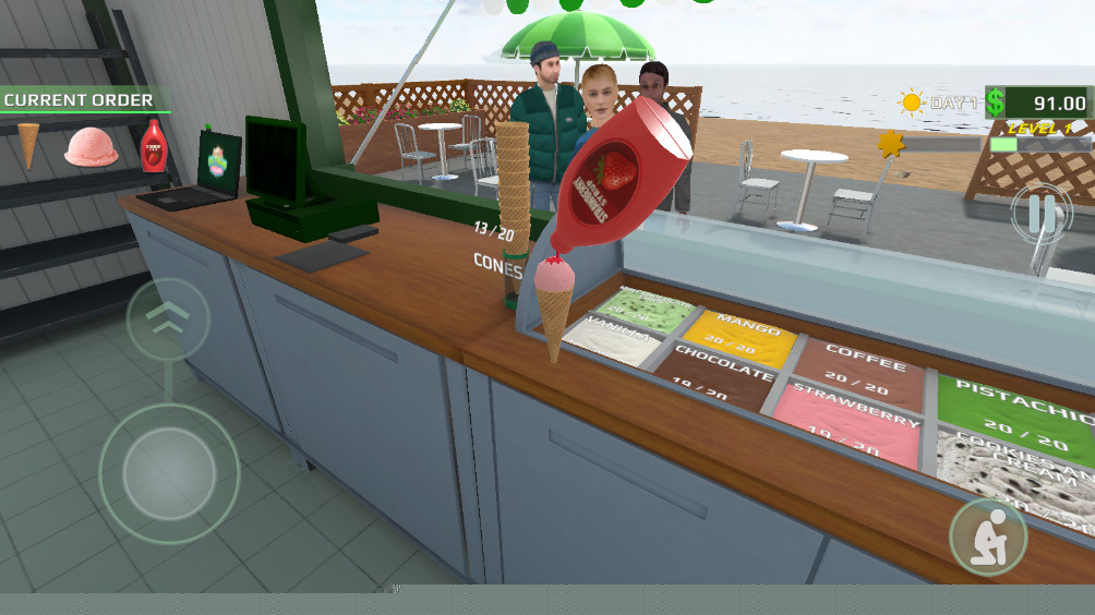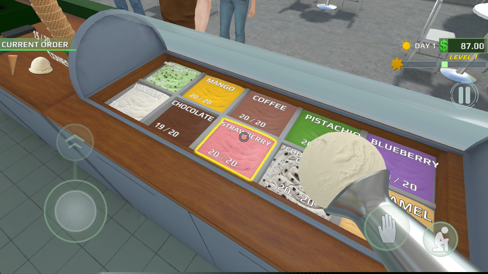 玩法核心是订单处理与产品制作。玩家需要高效处理排队顾客的订单,准确记忆其要求(如双球香草加草莓酱,不要坚果),并在操作台上快速完成制作。制作过程包含多个步骤,如选择蛋筒、挤压冰淇淋球、淋上酱料、添加点缀等,要求一定的手速和准确性。