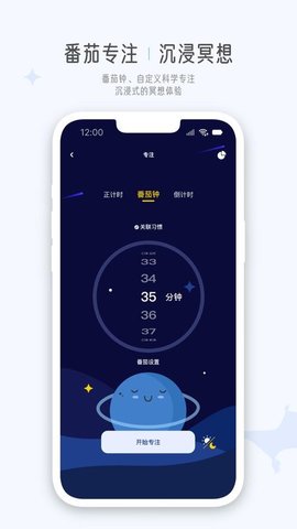 当需要为某个任务或学习时段投入专注时,请切换至底部的专注标签页。你可以选择经典的番茄钟模式,默认是25分钟专注加5分钟休息,你也可以通过设置自定义任意时长。或者,你可以选择正念冥想模式,从音频库中选择一个引导程序来放松身心。选定模式并设置好时间后,点击开始按钮,即可进入沉浸式专注时段。