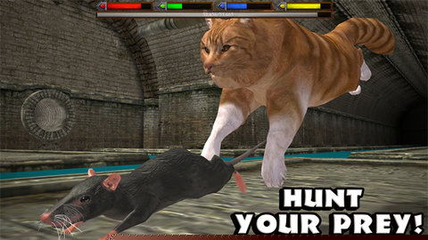 生存与狩猎:这是游戏最基础的玩法循环。玩家需要运用潜行技巧接近猎物,把握时机发动精准扑击。狩猎目标从老鼠、麻雀到兔子、鱼类不等,不同的猎物提供不同数量的经验与饱食度。失败则可能受伤,需要寻找安全的角落舔舐伤口恢复生命值。