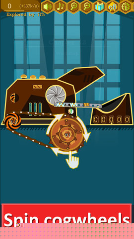 基础生产与自动化建设:游戏起点是手动互动,玩家通过旋转主齿轮产生基础硬币,快速点击掉落的硬币可获得倍数奖励。积累初始资本后,首要目标是购买发动机替代人力,实现齿轮的自动旋转。随后,通过添加更多从动齿轮与主齿轮啮合,可以进一步提升整体转速,从而增加单位时间的产出,这是构建自动化帝国的第一步。