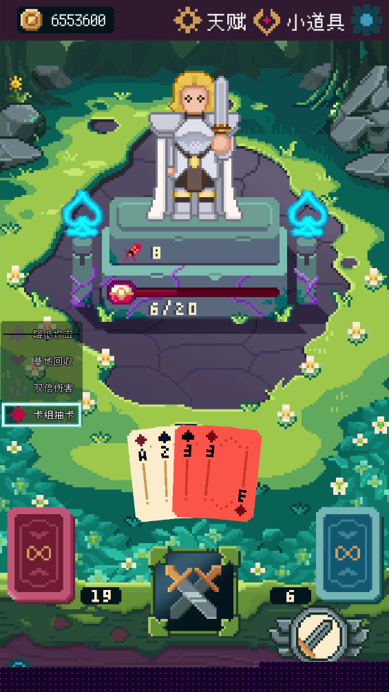 玩法核心是回合制卡牌战斗。进入战斗后,玩家每回合会从自己的命运牌组中随机抽取一定数量的手牌。玩家需要消耗行动点来打出手中的扑克牌,每张牌消耗1点行动点。出牌时需综合考虑敌方意图(下次攻击的伤害与效果)、己方状态以及手牌可能触发的花色组合效果。在面对敌人蓄力高伤攻击时,打出红桃花色的牌可能获得护盾;而在需要快速清场时,连续打出同花色的黑桃牌则能激活同花顺效果,造成巨额范围伤害。