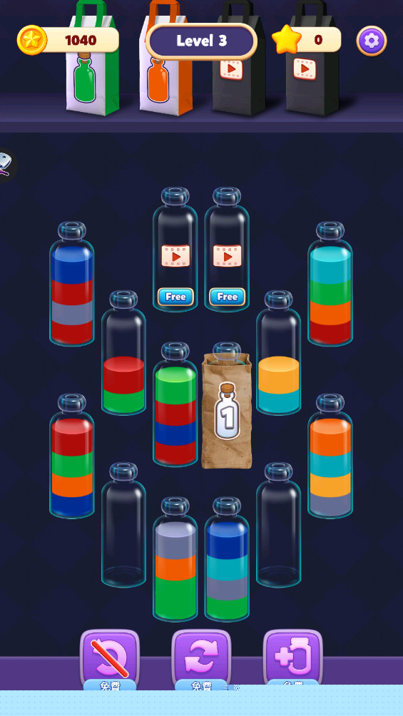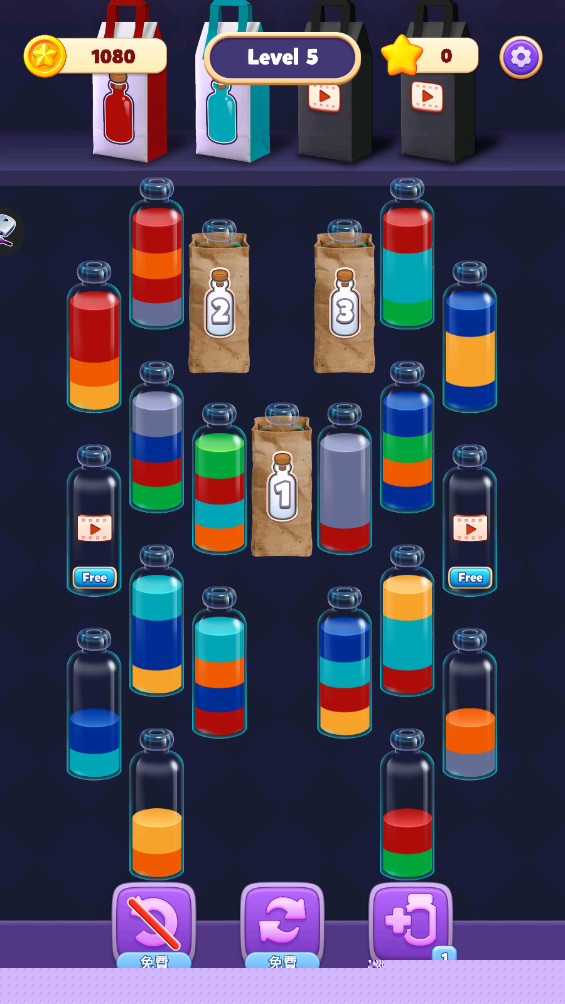 动态物理模拟系统:游戏突破传统消除游戏的静态框架,引入了真实的物理模拟。水瓶的倾倒、液体的晃动与溅射效果并非单纯动画,而是会实际影响棋盘布局。一个满溢的水瓶被消除后,其液体可能会填充相邻的空格或改变下方水瓶的颜色,这种机制要求玩家必须预判每一步操作可能引发的连锁物理反应,极大地提升了游戏的策略深度与不可预测的趣味性。