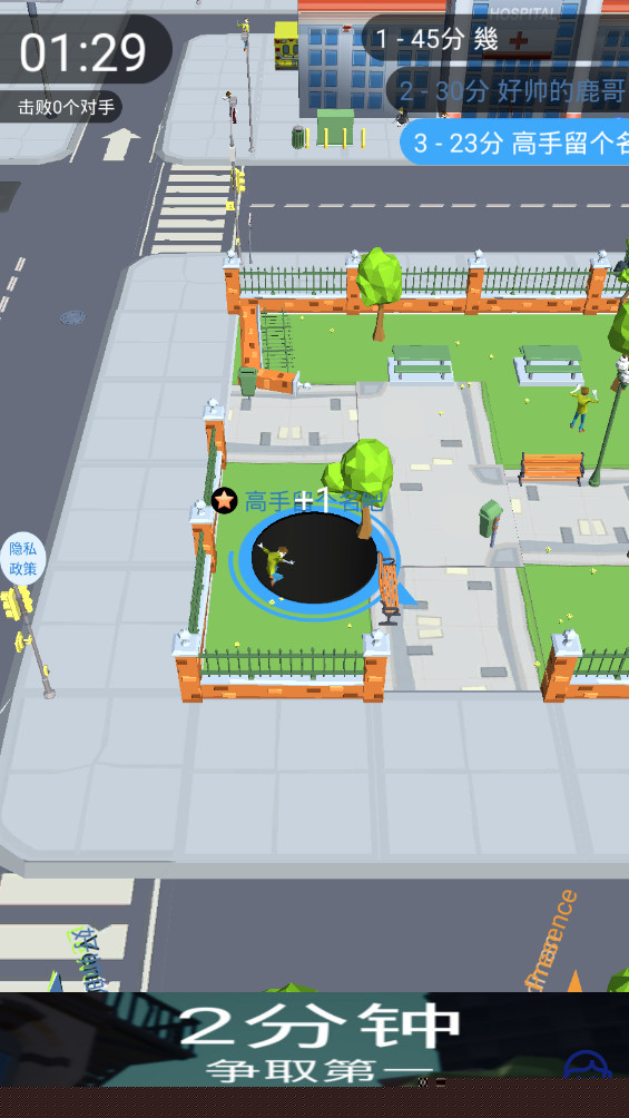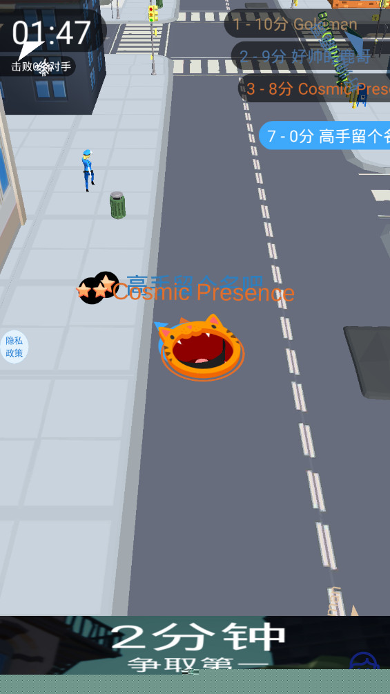 对抗玩法讲究策略而非蛮力。当遭遇体积相近的对手时,可以尝试将其引向地图边缘的固定障碍物或另一个大型黑洞附近,利用环境制造混乱。体积处于劣势时,则要灵活利用小巷、公园等复杂地形进行周旋,寻找吞噬大型物体反超的机会。