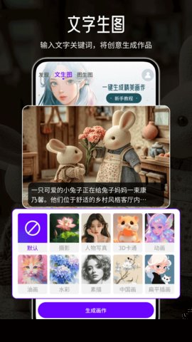 描述输入完成后,视线移至中部的风格选择区。这里以图标或标签形式展示了多种预设风格。您可以直接点击选择一种风格(如水彩画),也可以不选择,使用默认的通用模式。该区域通常提供抽象程度和细节密度等滑动条,向左滑动抽象条会增加画面的艺术感和概括性,向右滑动细节条则会使生成图像的局部更加精细和写实。