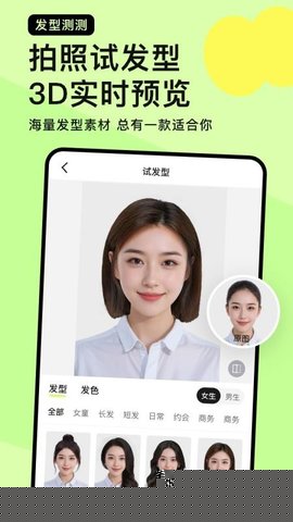虚拟发型试戴:用户上传照片后,可以从庞大的发型库中任意选择喜欢的发型进行虚拟试戴,即时看到该发型在自己头上的模拟效果,操作简单直观。