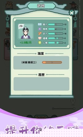 玩法一:规划与执行并重的生涯发展。游戏初期,玩家需专注于学业,通过课堂学习、图书馆研读、请教名师等方式提升知识属性,这直接关系到未来可选择的职业广度与起点高度。进入青年期,则需审慎规划首份职业,利用前期积累的属性与资源,在门槛各异的领域中做出选择,并在工作中通过完成项目、处理职场关系来积累经验、人脉与资本。