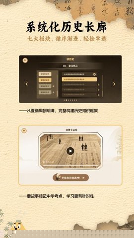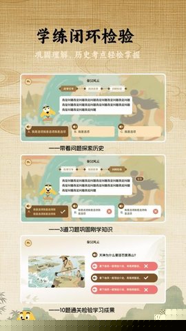 适趣大历史是一款将浩瀚历史知识转化为生动叙事与深度互动体验的综合性学习应用,巧妙地将跨越数千年的文明发展历程,编织成一系列脉络清晰、情节引人入胜的故事章节,打破传统历史学习的枯燥感,让用户在探索、游戏与思考中,自然地构建起系统化的历史认知框架,内容体系宏大,涵盖了从上古神话、帝国兴衰到近现代世界格局演变等关键历史阶段,并辅以大量经过考据的图文资料、文物复原图及场景化音频解说,使得遥远的历史事件与人物变得鲜活可感。无论是需要辅助课业学习、拓展知识视野的学生群体,还是纯粹出于兴趣希望深入了解人文历史的普通爱好者,都能通过其个性化的学习路径与丰富的模块设置,找到持续探索的动力与乐趣。