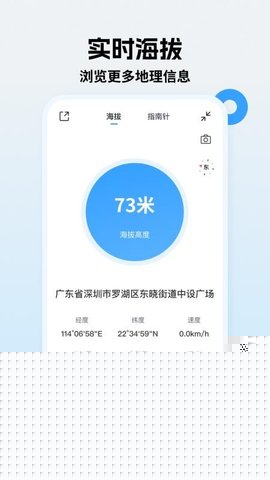 实时海拔仪表盘:软件主界面设计如同一个专业的仪表盘,集中动态显示最为关键的数据:实时海拔高度(以米/英尺为单位)、精确的经纬度坐标、当前移动速度以及水平方向。数据显示清晰醒目,一目了然,方便用户在行进中快速瞥视掌握核心信息。